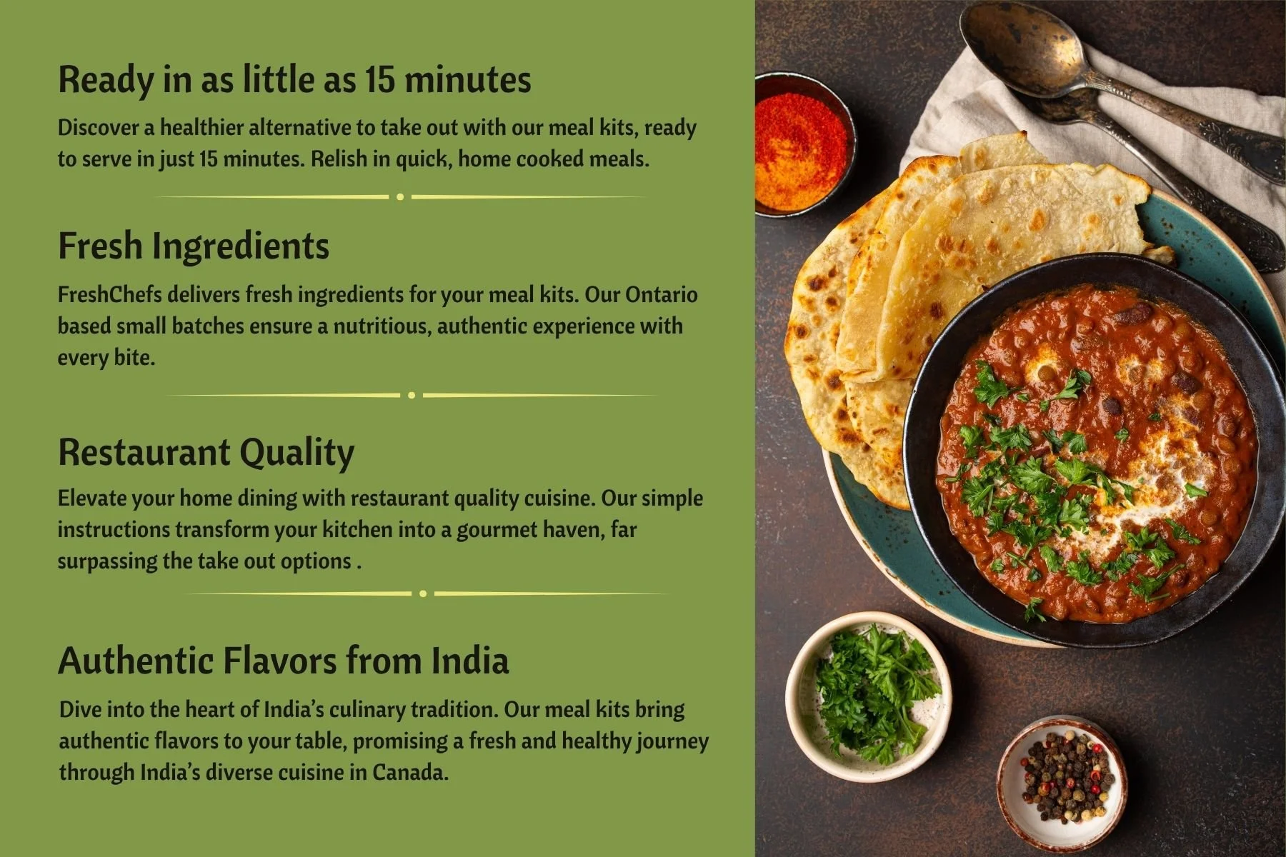 FreshChefs is a meal kit delivery service focused on bringing authentic Indian cuisine to the Greater Toronto Area. Their commitment to offering a diverse range of healthy, easy-to-prep Indian recipes sets them apart. Each dish is thoughtfully curated, providing a well-loved Indian recipe that can be prepared in just 15 minutes, making it both convenient and delicious for those looking to enjoy authentic flavors at home.