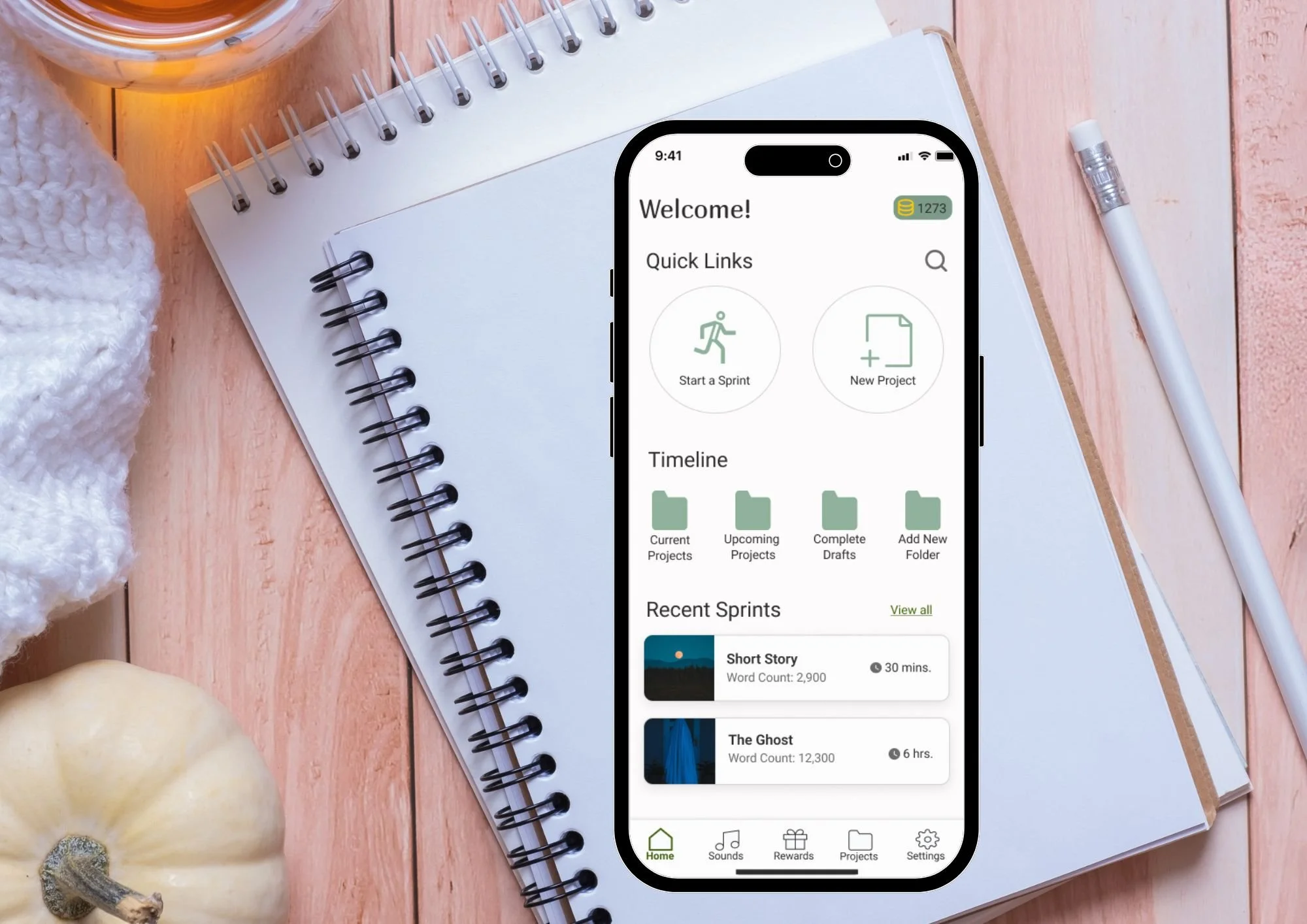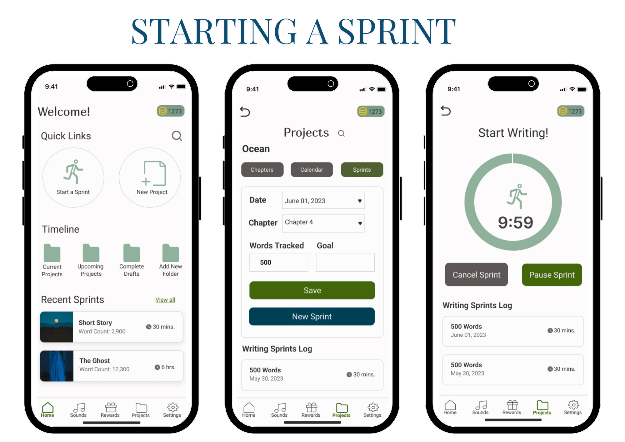 Keeping in mind that users can be using this app to write as a hobby or business. I decided to make the app very easy to use and playful all while staying organized. I created folders to keep past, future and current projects easily accessible. I made the two main buttons and icons large enough and simple for quick access. The two buttons identify the main uses for this app to users. A user will be looking to either start a sprint for a current project or start a new project all together.